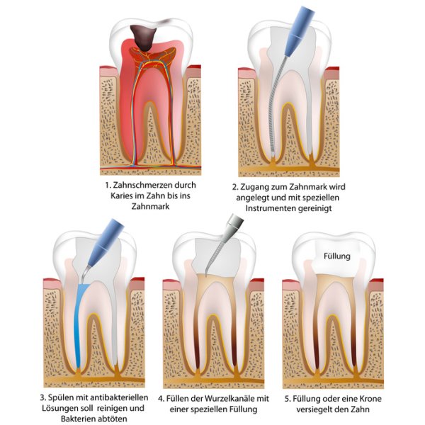 Bei einer Wurzelbehandlung wird nach einer Betäubung des betroffenen Zahnes das entzündliche Pulpengewebe aus dem Wurzelkanal entfernt, der Wurzelkanal aufbereitet , gespült und erweitert und abschliessend mit Guttapercha ( eine Art Naturkautschuk) gefüllt. Dabei ist es wichtig, das erkrankte Gewebe und die Baktierien möglichst vollständig aus dem Wurzelkanal zu entfernen.